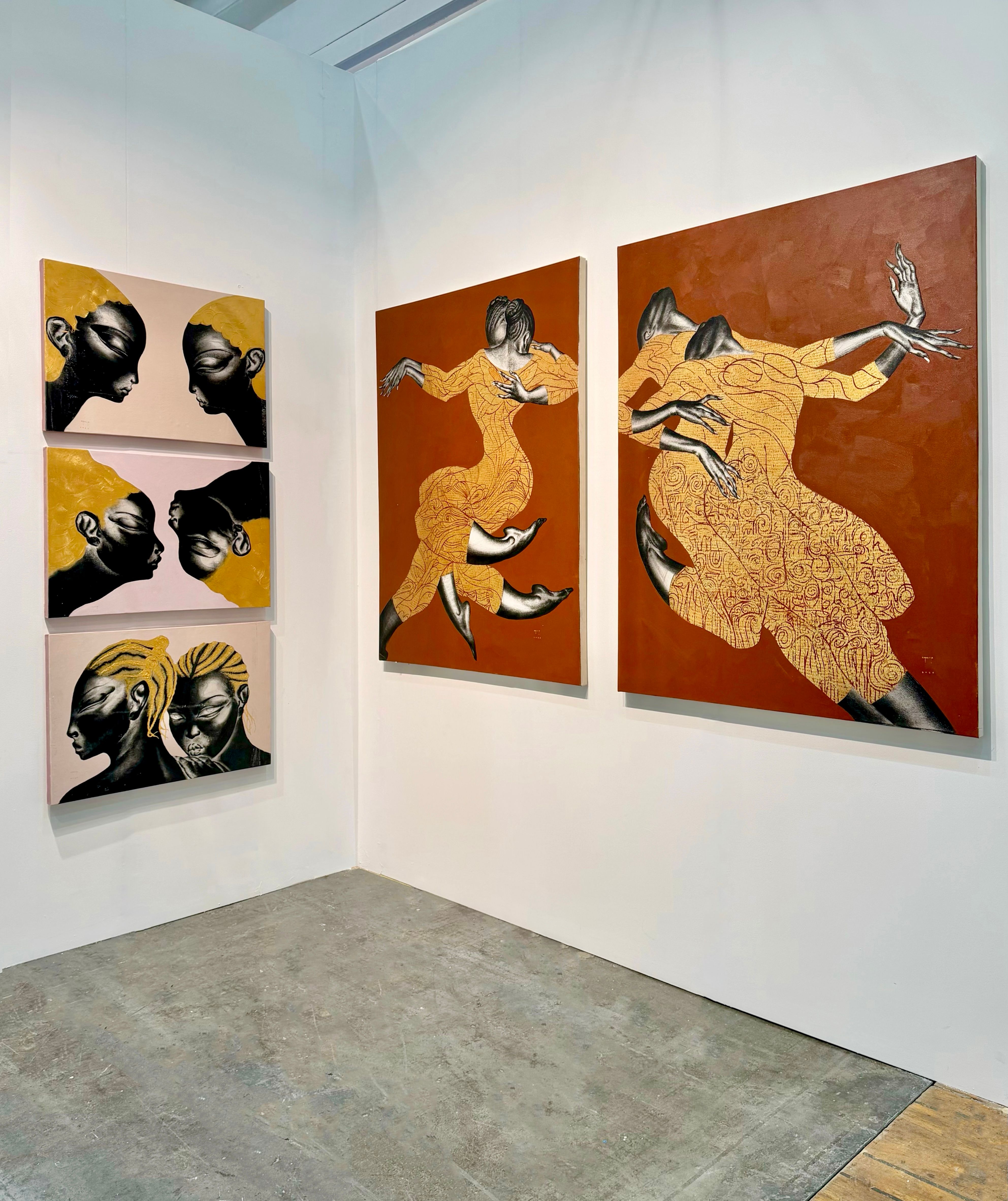 His figures are bold and dynamic, often depicted in communal, interlocked stances that draw on the physical language of Yoruba dance and spirituality. These compositions speak to intimacy, ritual, and shared experience, positioning the body not as an isolated subject but as part of a wider social and emotional structure.